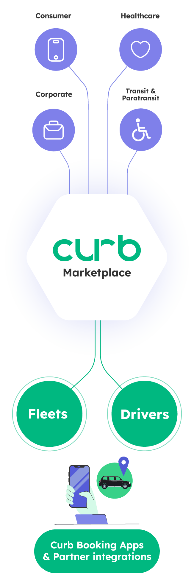 Curb Flow aggregates ride requests from Curb and multiple eHail demand providers into one system, delivering metered trip opportunities daily to drivers through their existing Curb setup, where demand providers must deliver value to drivers in order to access the taxi network.